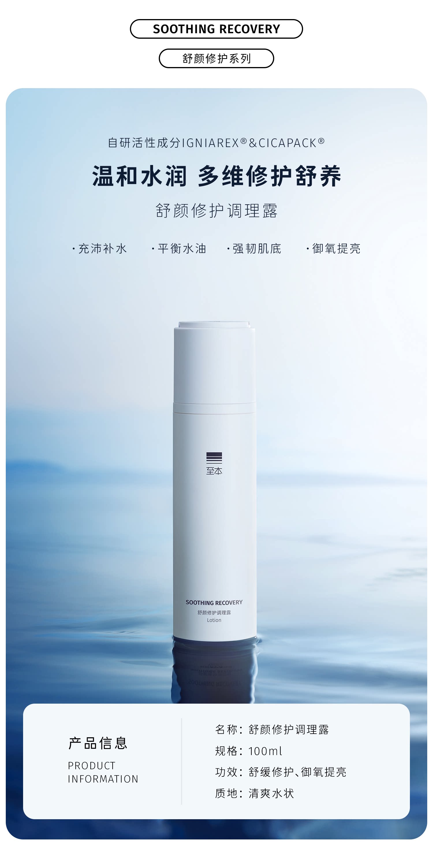 产品描述: 产品名称:至本 舒颜修护调理露 品牌: 至本 品名: 舒颜修护调理露 化妆品备案编号/注册证号: 沪G妆网备字2021502375 功效: 补水 舒缓肌肤 清爽 水油平衡 规格类型: 正常规格 是否为特殊用途化妆品: 否 净含量: 100ml 限期使用日期范围: 2024-11-01至2024-12-31 化妆品保质期: 36个月