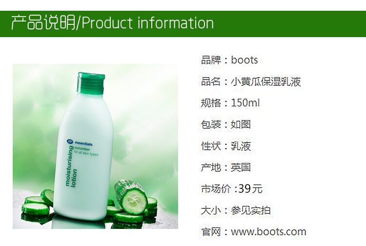 产品描述: 产品名称: BOOTS 高效保湿乳液 品牌: BOOTS boots系列: 高效保湿乳液 产地: 英国 乳液/面霜品类: 乳液 保质期: 24个月 功效: 保湿 化妆品净含量: 150g/ml 规格类型: 正常规格